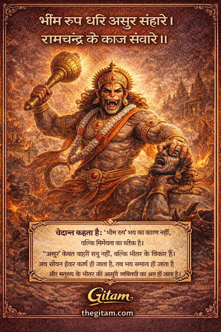 यह चौपाई वेदान्त के निर्भयता-सिद्धान्त को प्रकट करती है। “भीम रूप” भय का कारण नहीं, बल्कि भय के अभाव का प्रतीक है। वेदान्त कहता है कि भय अहंकार से उत्पन्न होता है—जब तक “मैं” हूँ, तब तक डर है। हनुमान जी का भीम रूप उस स्थिति को दर्शाता है जहाँ कर्तापन विलीन हो चुका है।