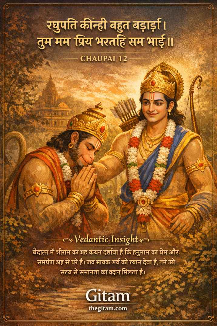 यह चौपाई दर्शाती है कि वेदान्त में सच्ची महानता पद, शक्ति या जन्म से नहीं, बल्कि गुण और समर्पण से आती है। हनुमान जी वानर हैं, फिर भी राम उन्हें अपने भाई भरत के समान मानते हैं—यह आत्मिक समानता का उद्घोष है।