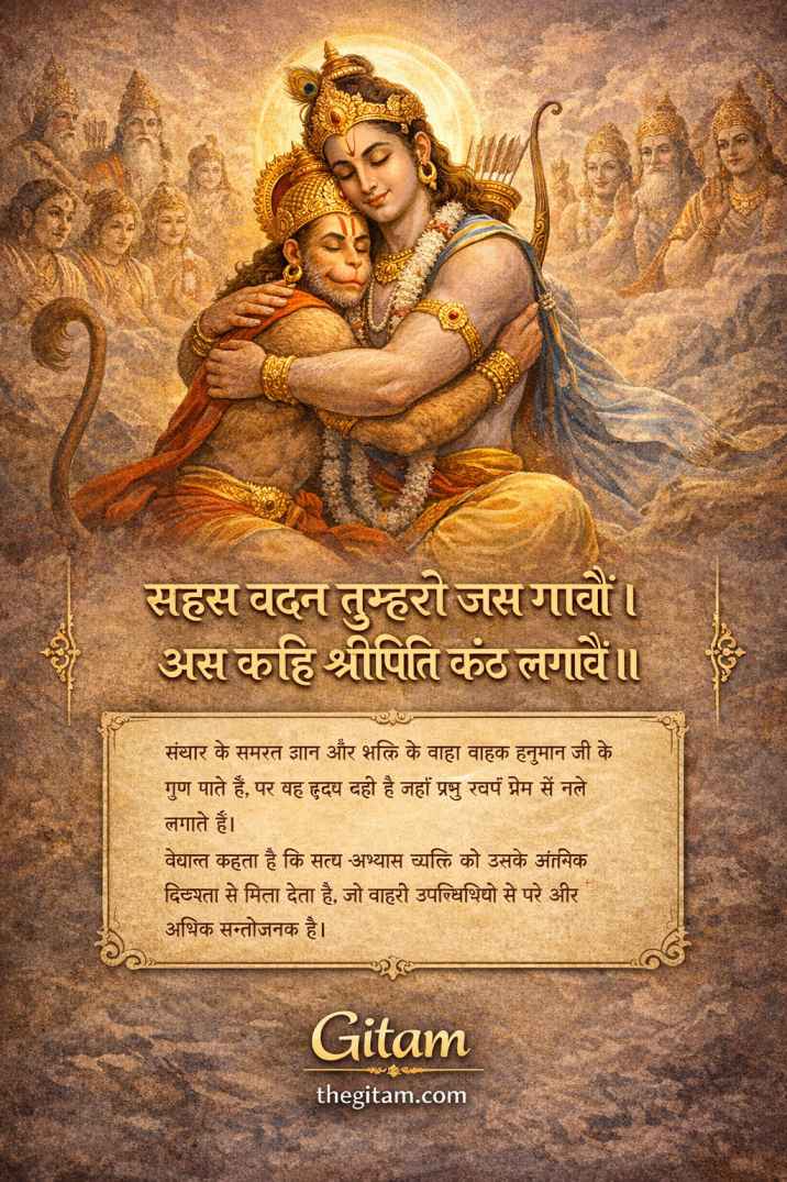 यह चौपाई अनंत गुणों की सीमाहीनता को दर्शाती है। वेदान्त में आत्मा का यश अनंत है—उसे शब्दों में बाँधा नहीं जा सकता। राम का यह कथन हनुमान के अहंकार को नहीं बढ़ाता, बल्कि उनके शून्य-अहं को दर्शाता है।