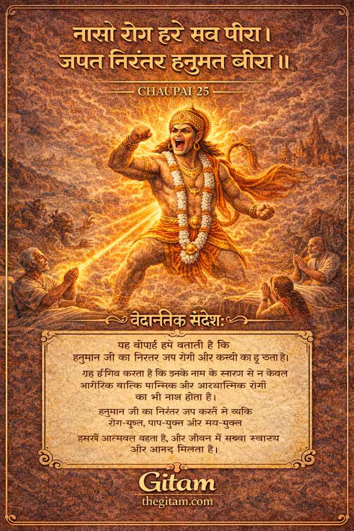 यह चौपाई वेदान्त के मनोवैज्ञानिक पक्ष को उजागर करती है। रोग और पीड़ा केवल शरीर की नहीं, मन की भी होती हैं। निरंतर जप का अर्थ यांत्रिक दोहराव नहीं, बल्कि चित्त का स्थायी संरेखण है।